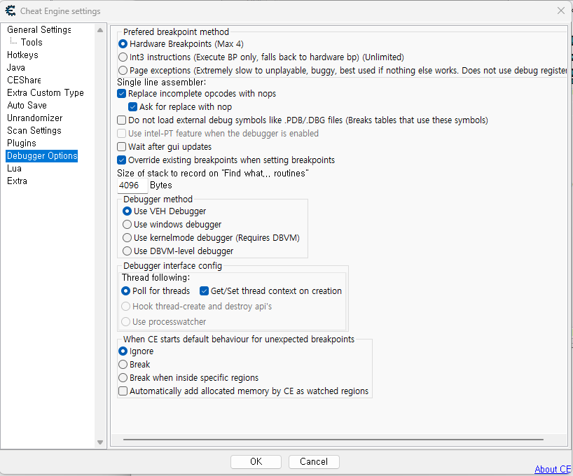 4. Settings에 들어가서 기초 세팅을 합니다. Debugger Options와 Extra를 세팅해주어야 하며, 기본적인 세팅 값은 다음과 같습니다.