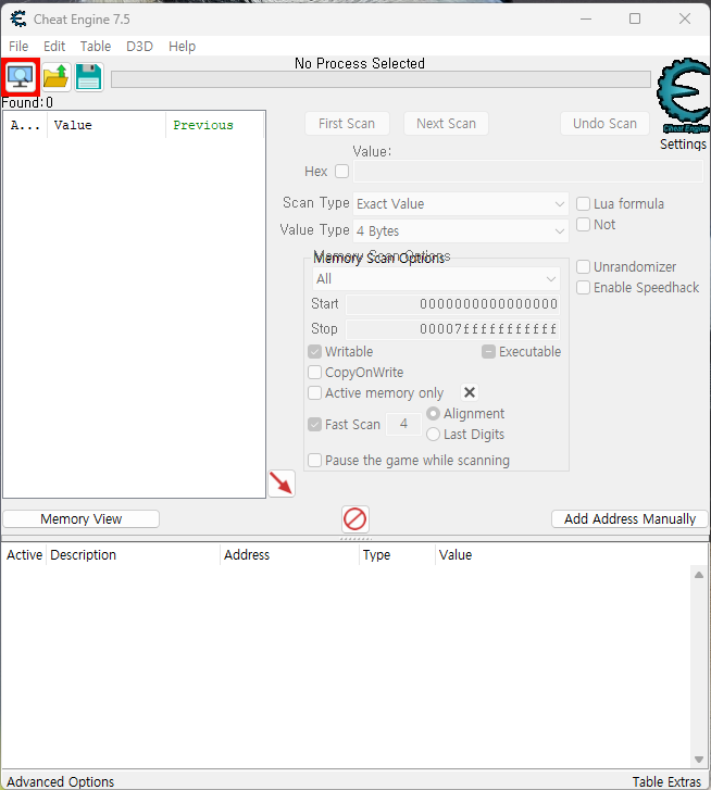 3. 다운받은 Cheat Engine을 실행시켜줍니다. 이때 만약 PC에 Riot Vanguard가 깔려 있으면, Cheat Engine이 비정상적으로 실행되므로 Riot Vanguard를 반드시 삭제나 종료시킨 후에 Cheat Engine을 실행시켜야합니다.