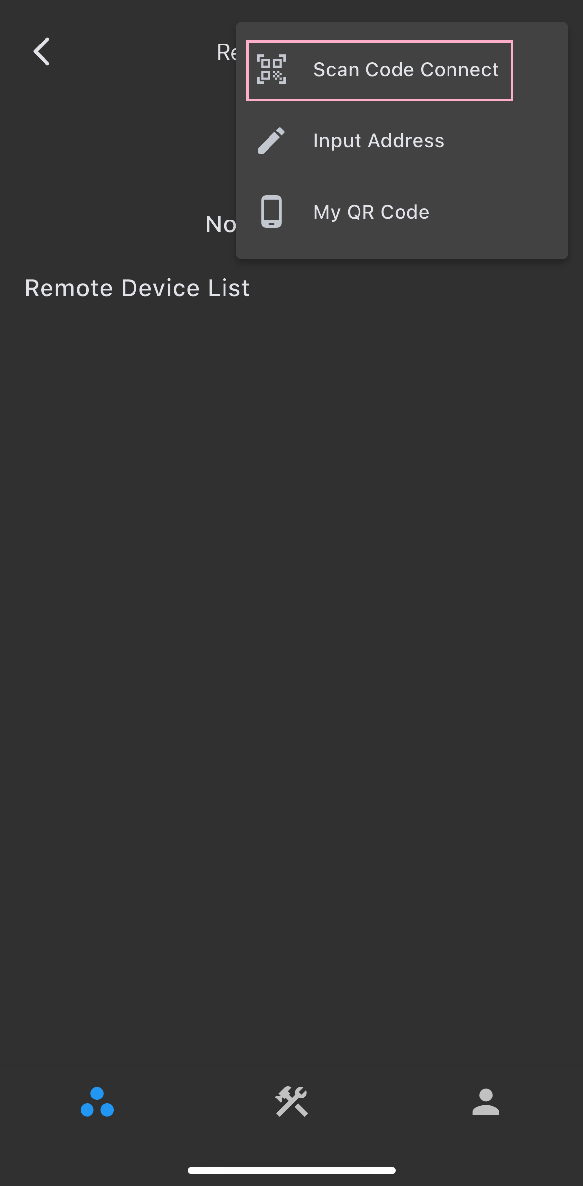 8. Remote Device 메뉴에 접속하여 우측 상단에 있는 +버튼을 누르고, Scan Code Connect를 선택합니다.