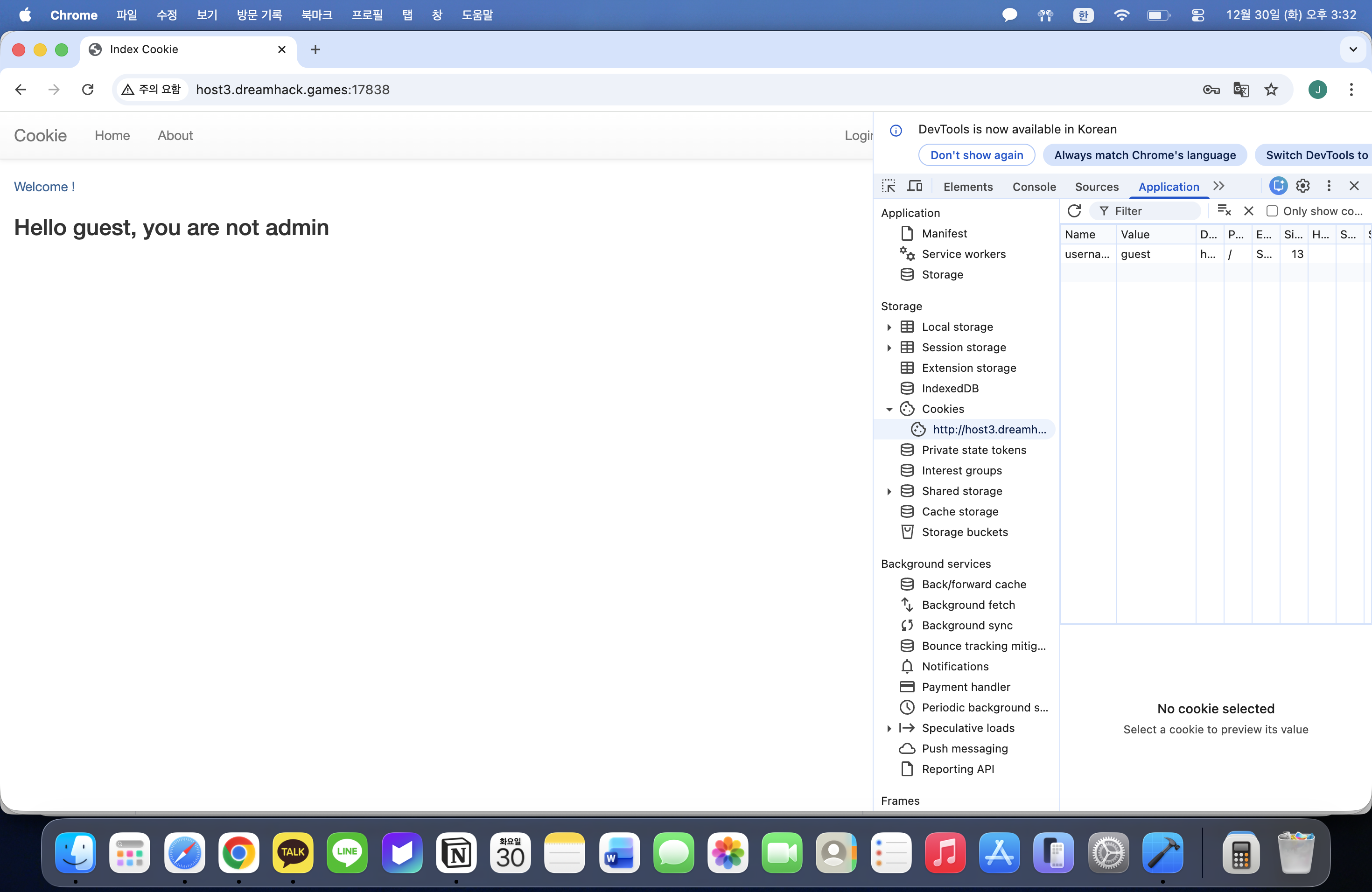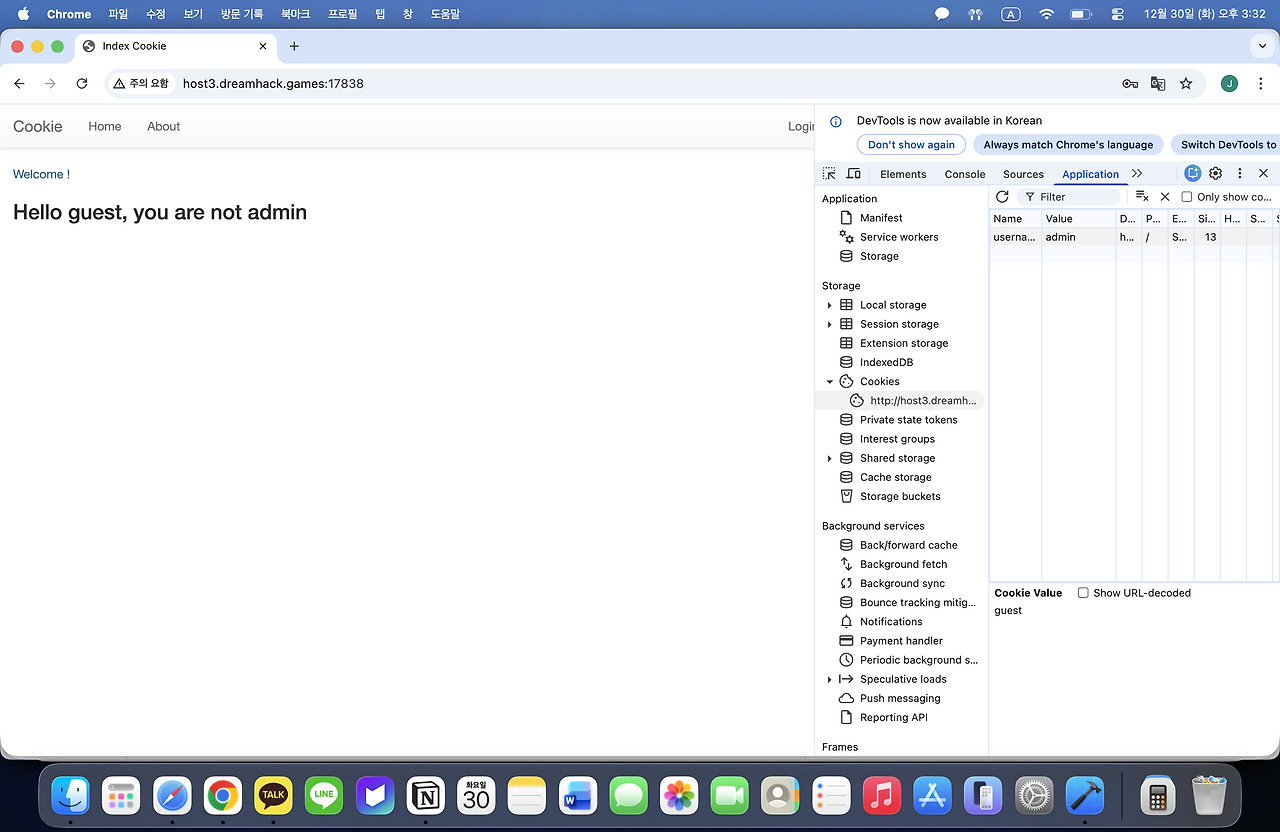 Dreamhack에서 cookie문제 설명에 쿠키로 인증 상태를 관리하는 로그인 서비스라는 설명이 있다. cookie는 개발자 도구에서 쉽게 확인이 가능한 것을 생각한다.