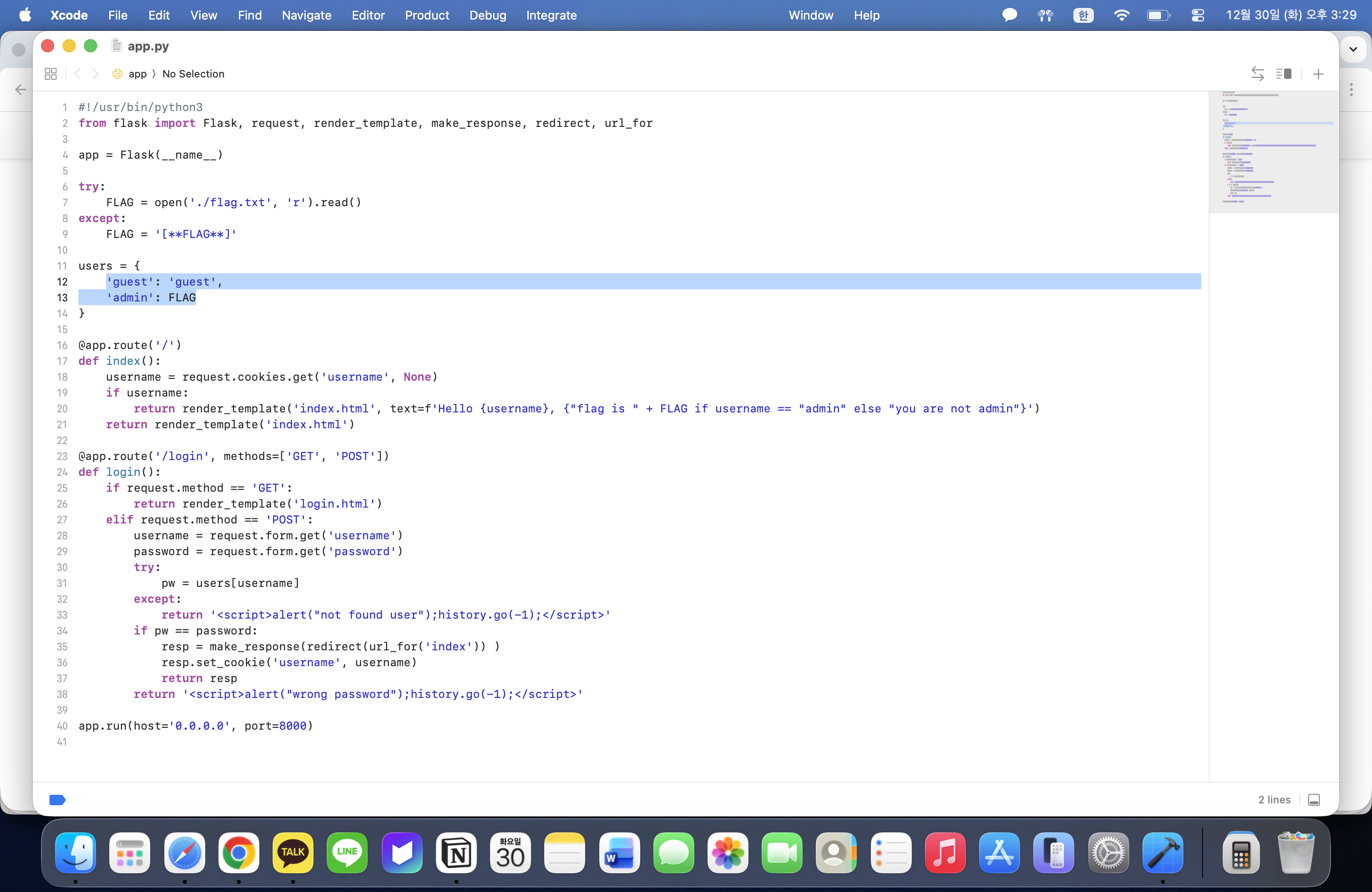 주어진 app.py 파일을 열어 본 결과 users라는 항목에 guest와 admin이 존재한다.