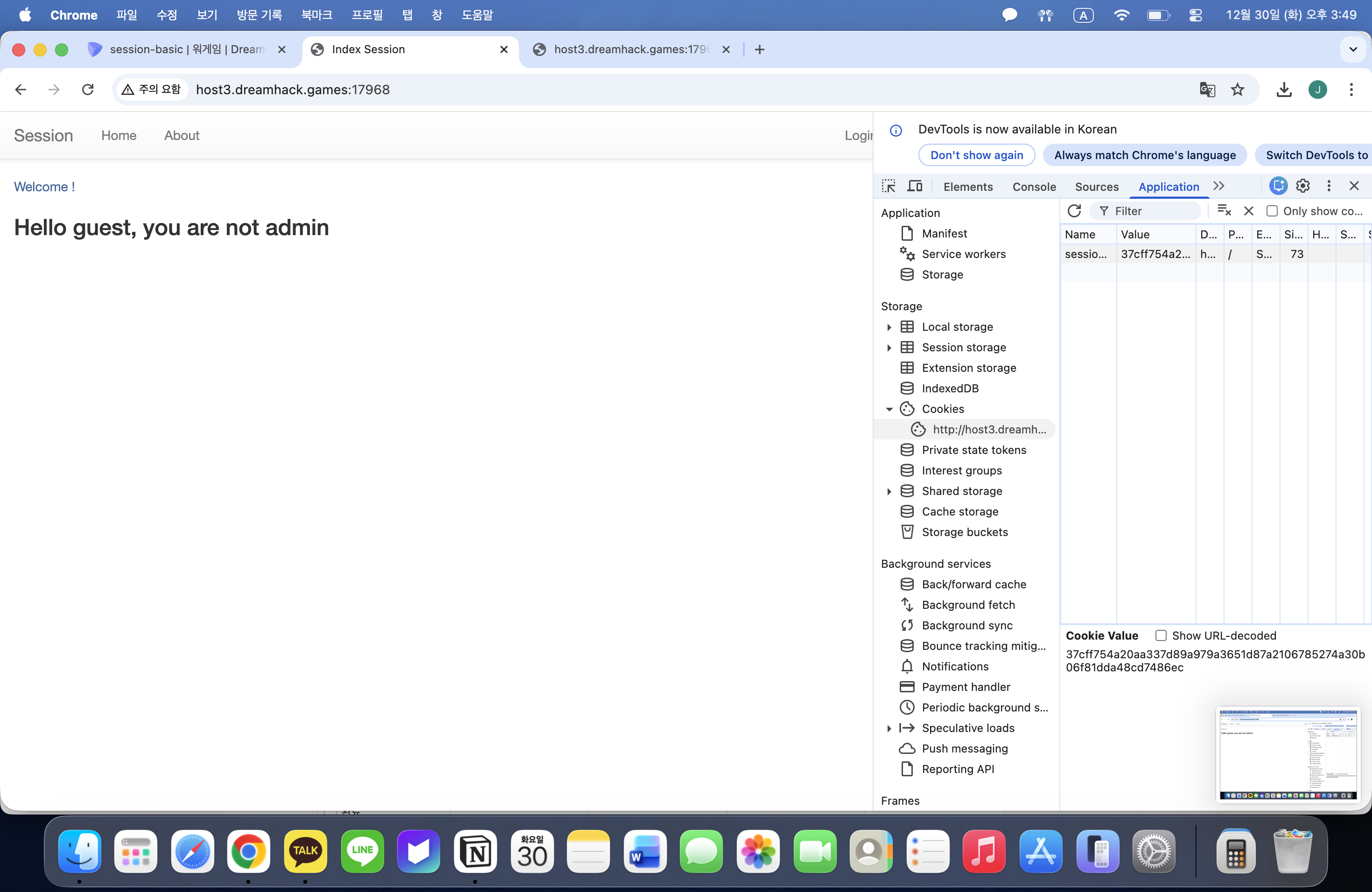 개발자 도구-Application-Cookies를 선택하고 session값을 확인한 후에, /admin 페이지에 들어가 guest에 맞는 세션 값이 들어가서 이 페이지가 진짜 정보를 갖고 있음을 확인한다.