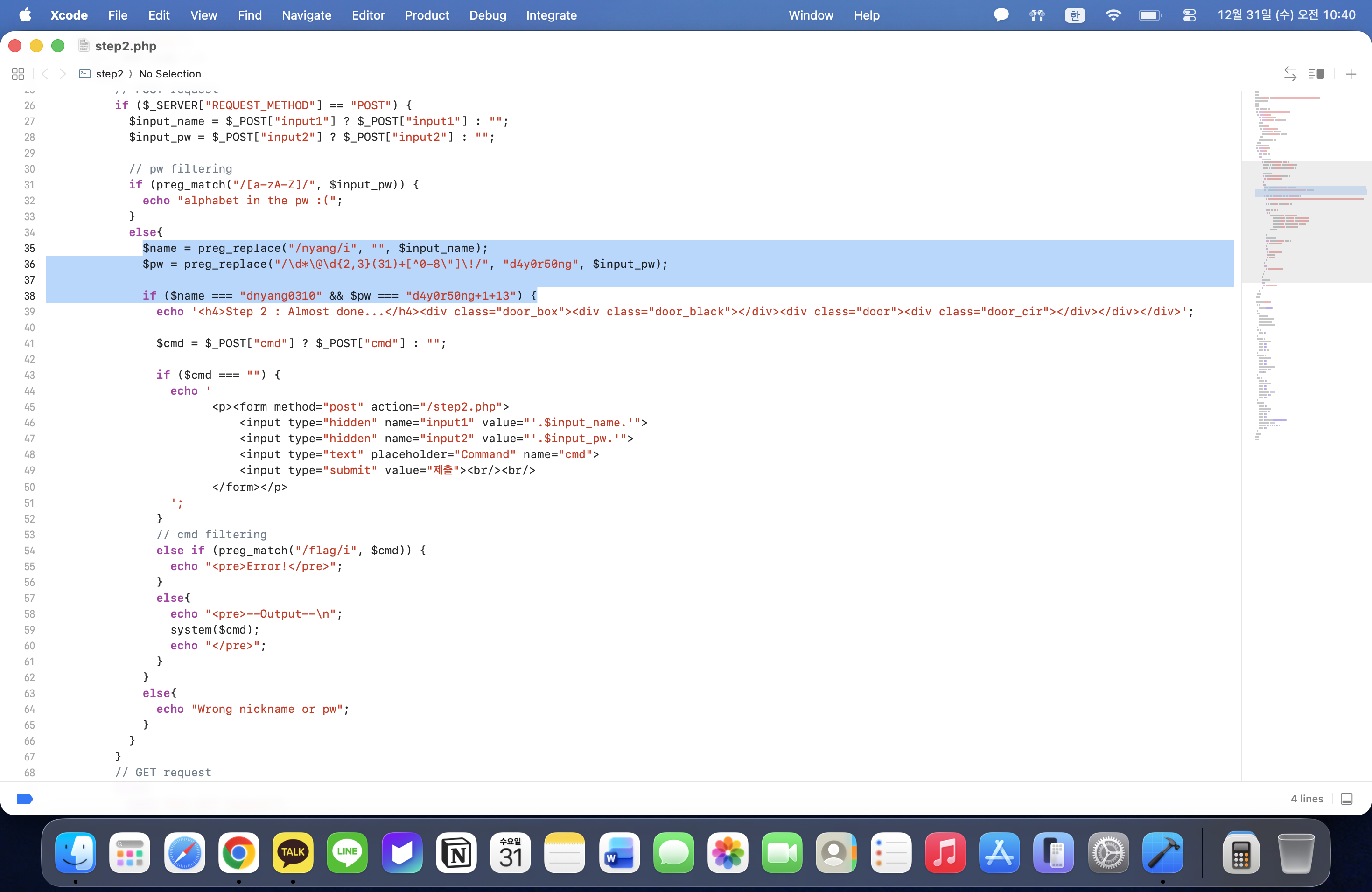 step2.php를 보면, dnyang0310이 name으로, d4y0r50ng+1+13이 pw로 가야되는 것을 확인할 수 있다. 다만 위에 보면 알겠지만 preg_replace에서 name에는 nyang을 공백으로, /\d*\@\d{2,3}(31)+[^0-8\"]\!/"를 d4y0r50ng으로 치환해준다는 것을 확인 가능하다. 나아가 pw에 알파벳이 들어가면 오류 메시지를 출력하도록 코딩되어 있다.
