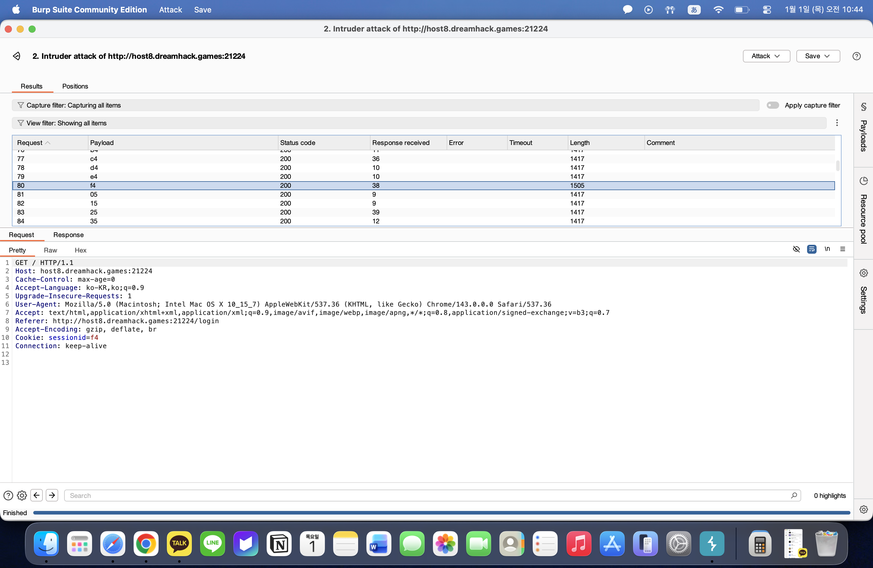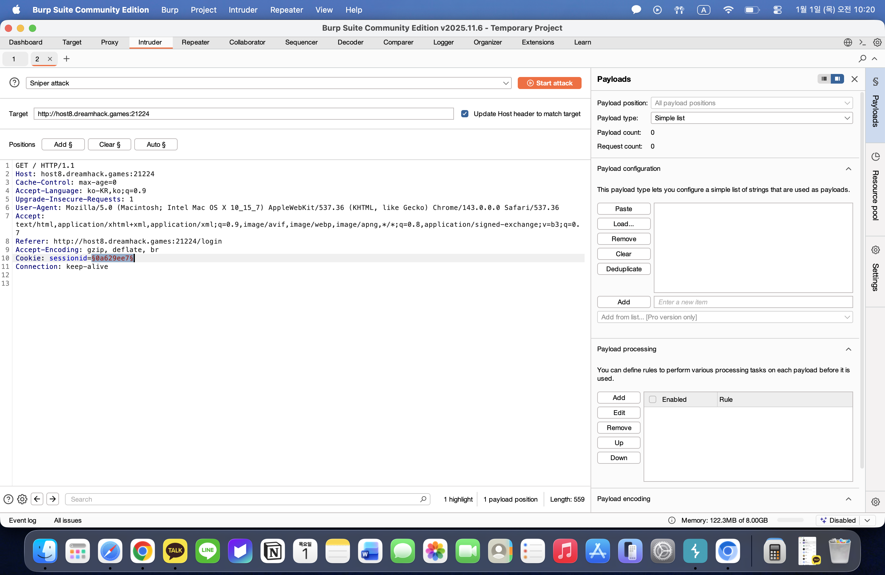 Burp Suite의 Proxy 부분에서 session id를 다시 한번 확인했을 때, 기존의 3번 시도와 또 다른 무작위 16진수의 난수가 생성되었음을 확인한다. 이 Request의 내용을 Intruder로 옮긴다.
