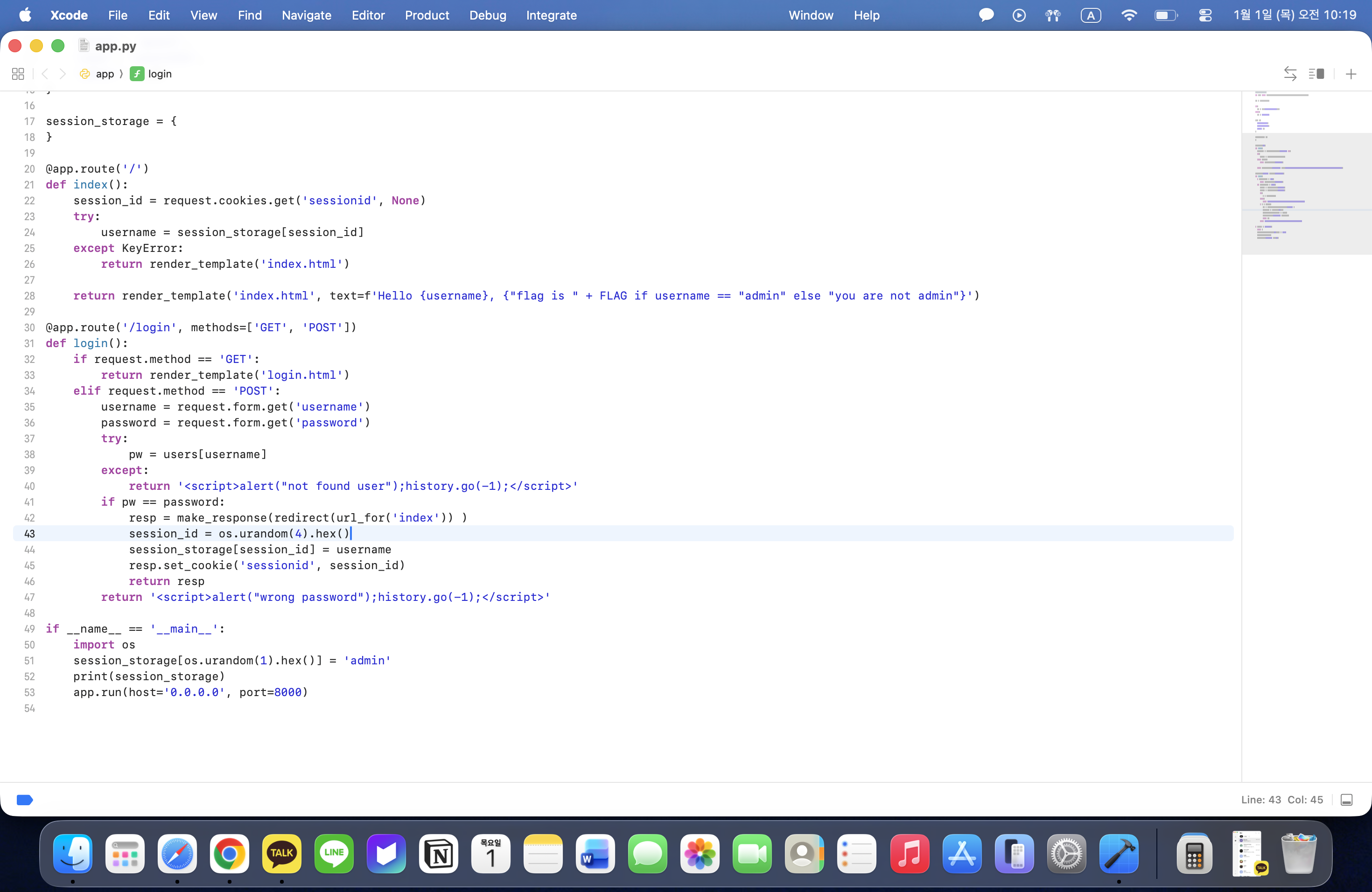 먼저 제공된 파이썬 파일을 확인해봤더니, guest, user, admin 총 3가지 계정이 존재하며, admin은 FLAG를 부여한다. session_id와 session_storage를 잘 보면 urandom(4)와 urandom(1)의 존재를 확인 가능하다. 아무래도 session과 연관된 부분일거라고 생각이 된다. 로그인을 먼저 해보면 대략 감이 잡힐 듯 싶다.