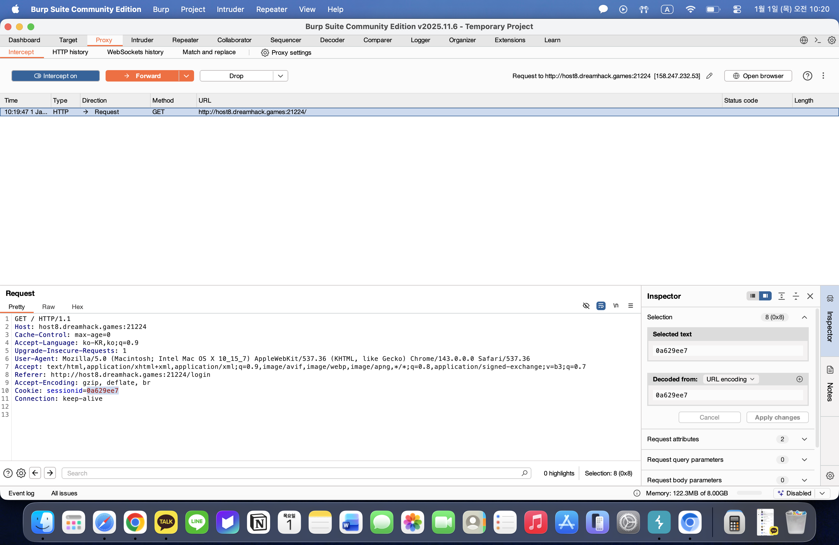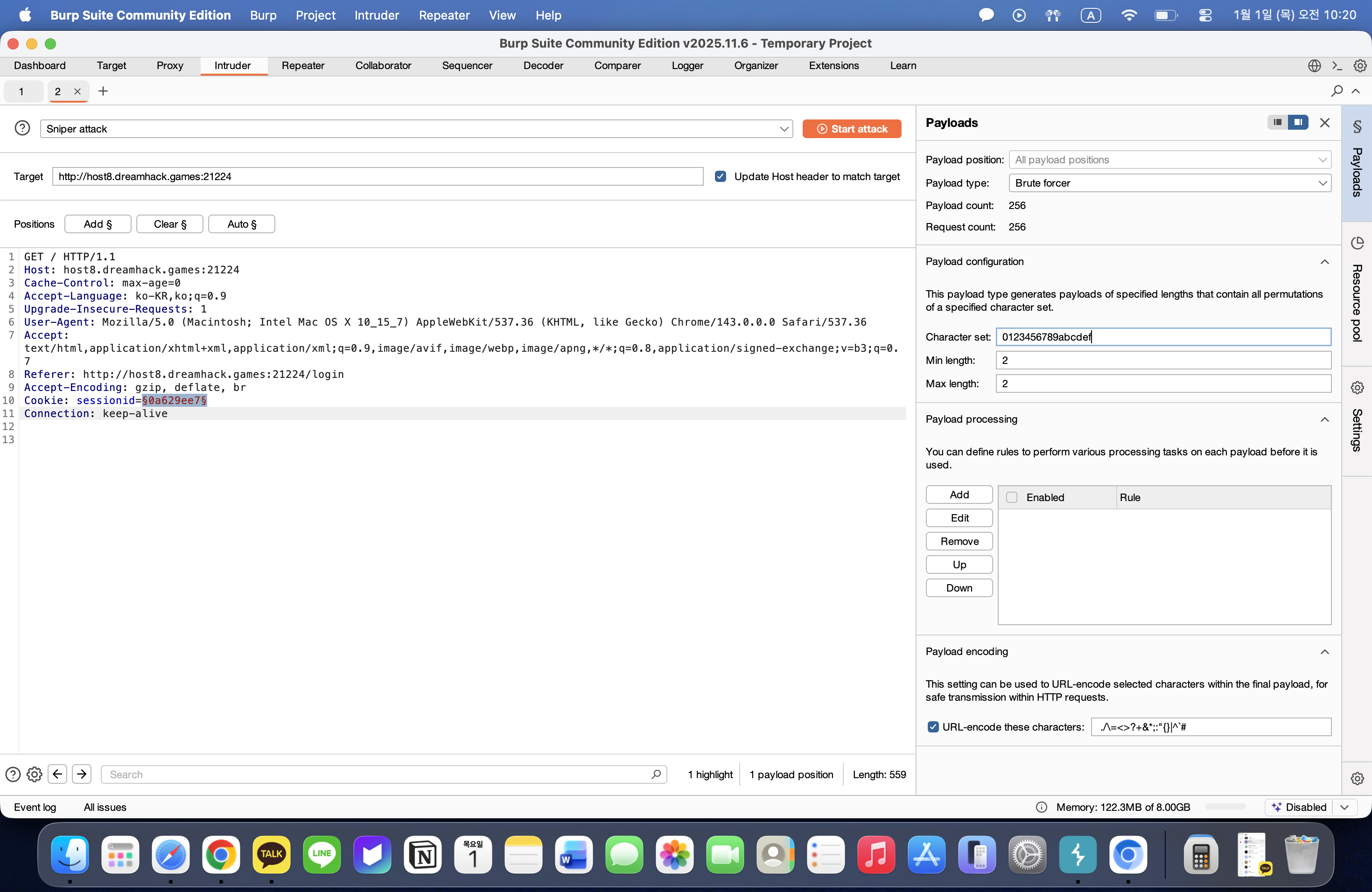 Burp Suite의 Proxy 부분에서 session id를 다시 한번 확인했을 때, 기존의 3번 시도와 또 다른 무작위 16진수의 난수가 생성되었음을 확인한다. 이 Request의 내용을 Intruder로 옮긴다.
