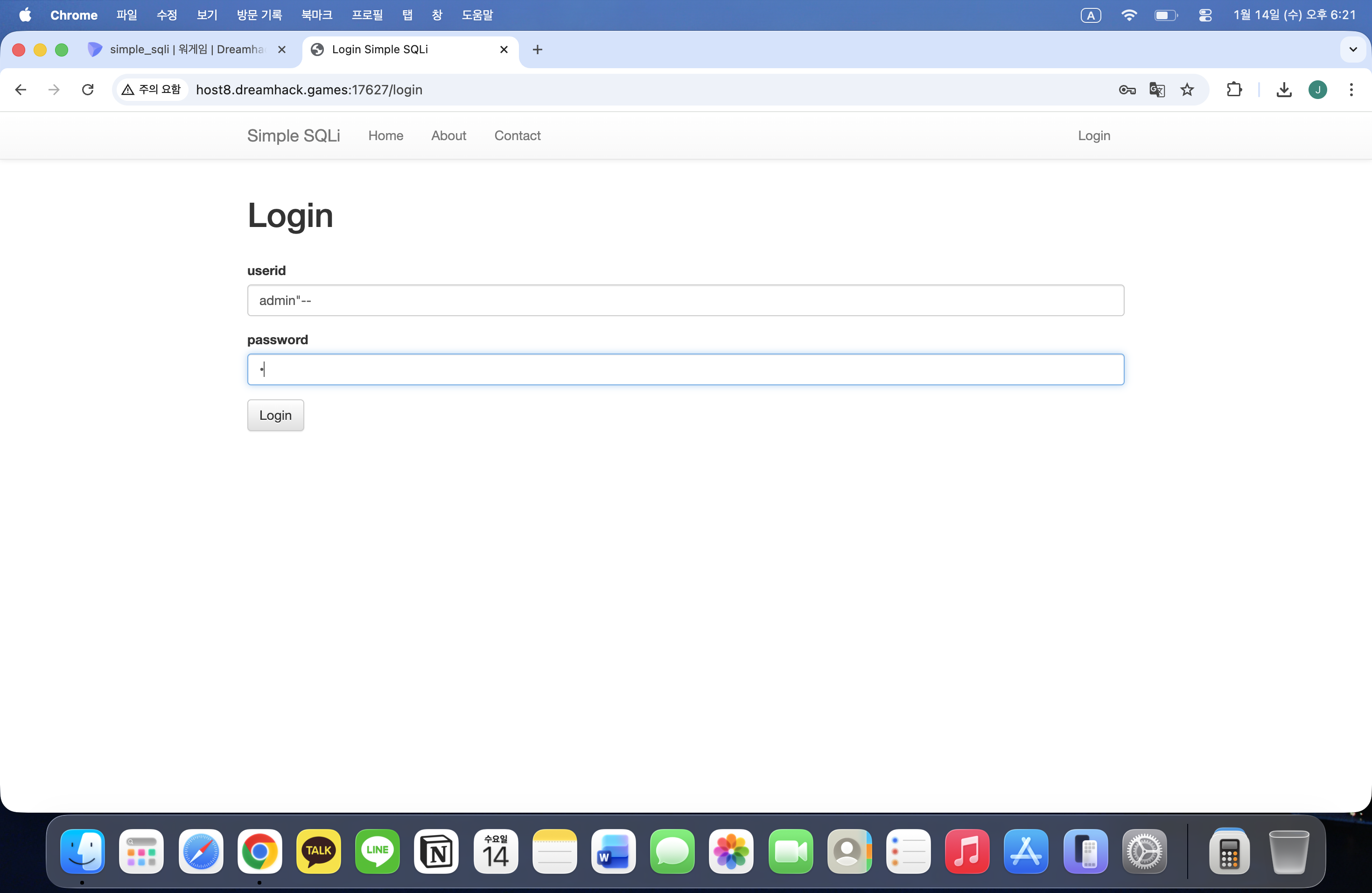 admin"--로 비밀번호 부분은 무시해주면서 userid에는 admin이 들어가게 해주고, 비밀번호에는 아무 글자나 입력한다.