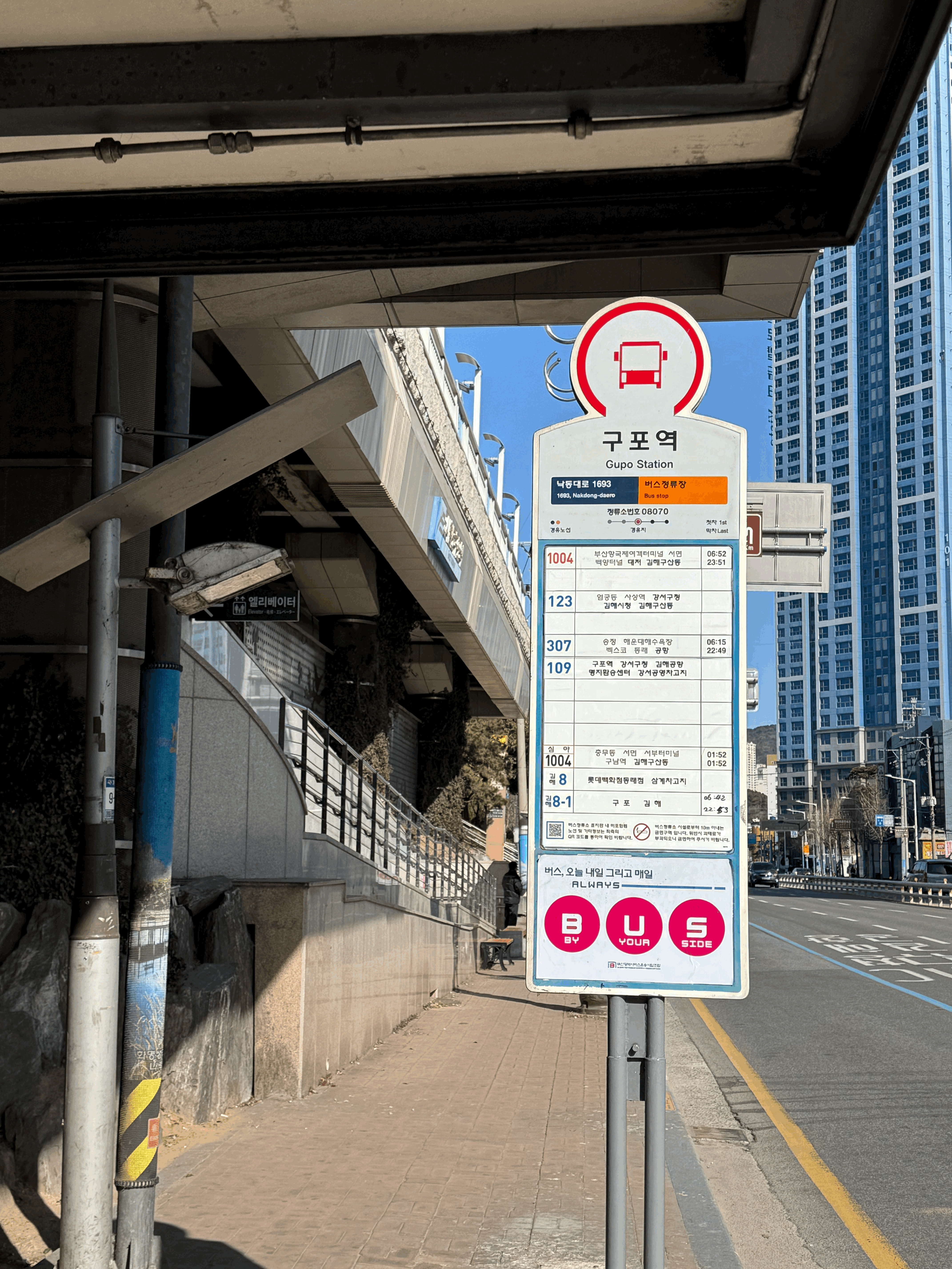 구포역은 부산역이나 서울역만큼 엄청 크지는 않았고, 공사중이여서 좀 혼잡했다. 구포역에서 나와 구름다리를 통해 지하철 구포역사 앞에 있는 구포역 버스정류장에서 김해공항가는 버스에 탑승했다. 109번, 307번, 강서 마을버스 등등 정말 많은 버스들이 김해공항으로 가기 때문에 적당히 시간 맞춰서 오는거를 탑승하면 된다. 나는 109번을 탑승했다.