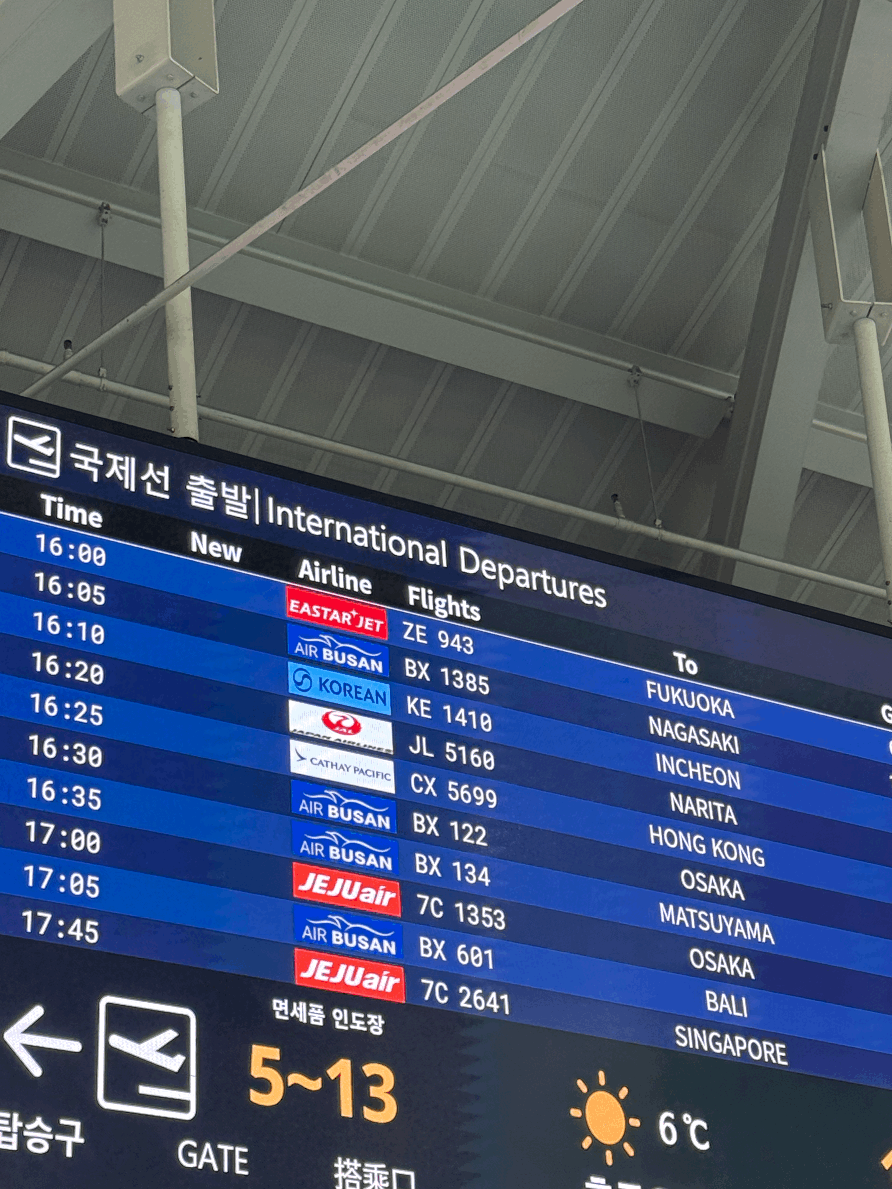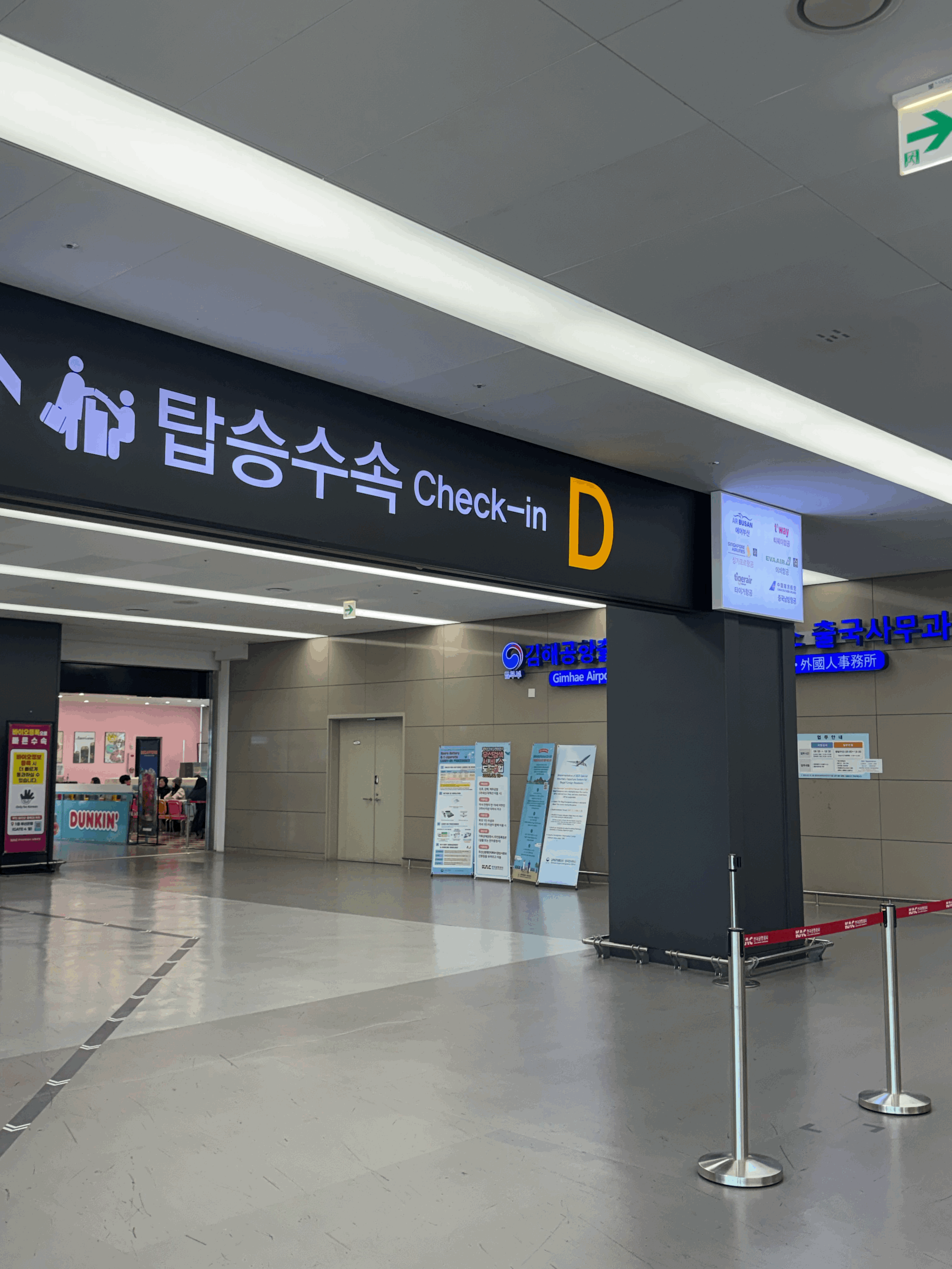 에어부산은 김해공항 국제선 터미널의 확장된 부분인 D카운터를 사용한다. D카운터쪽을 보면 에어부산 카운터가 있지만, 그 전에 왼쪽에 있는 셀프 체크인 기기를 이용하여 좌석지정과 비행기 탑승권 수령 후에 짐을 부치러 카운터로 이동하면 된다. 위탁수하물은 15kg이다. 최근에 FSC 위주로 타고다녀서 15kg가 감이 안왔다. 근데 이번에 30인치 캐리어에 옷 빼고 뭐 넣지도 않았는데 8kg이라 좀 유의해서 짐을 준비해야겠다고 생각했다. 깜빡하고 못찍었는데, 여권이 만료되서 최근에 바이오 인증(정맥 인증)을 다시 등록했다. 출발층(2층)이 아닌 도착층(1층)에 관련된 등록 기기가 존재하며, 5분 이내로 손쉽게 등록할 수 있다.