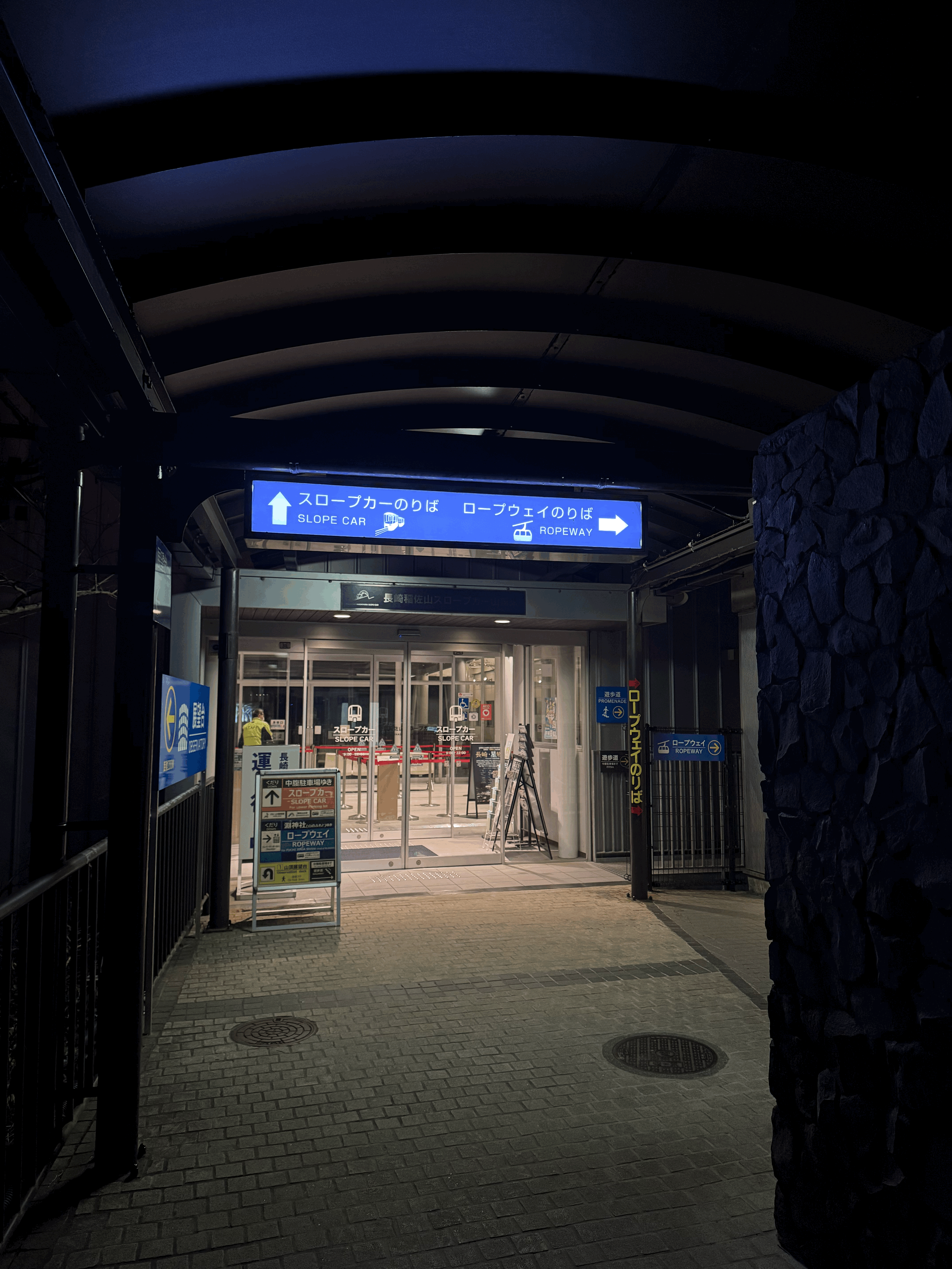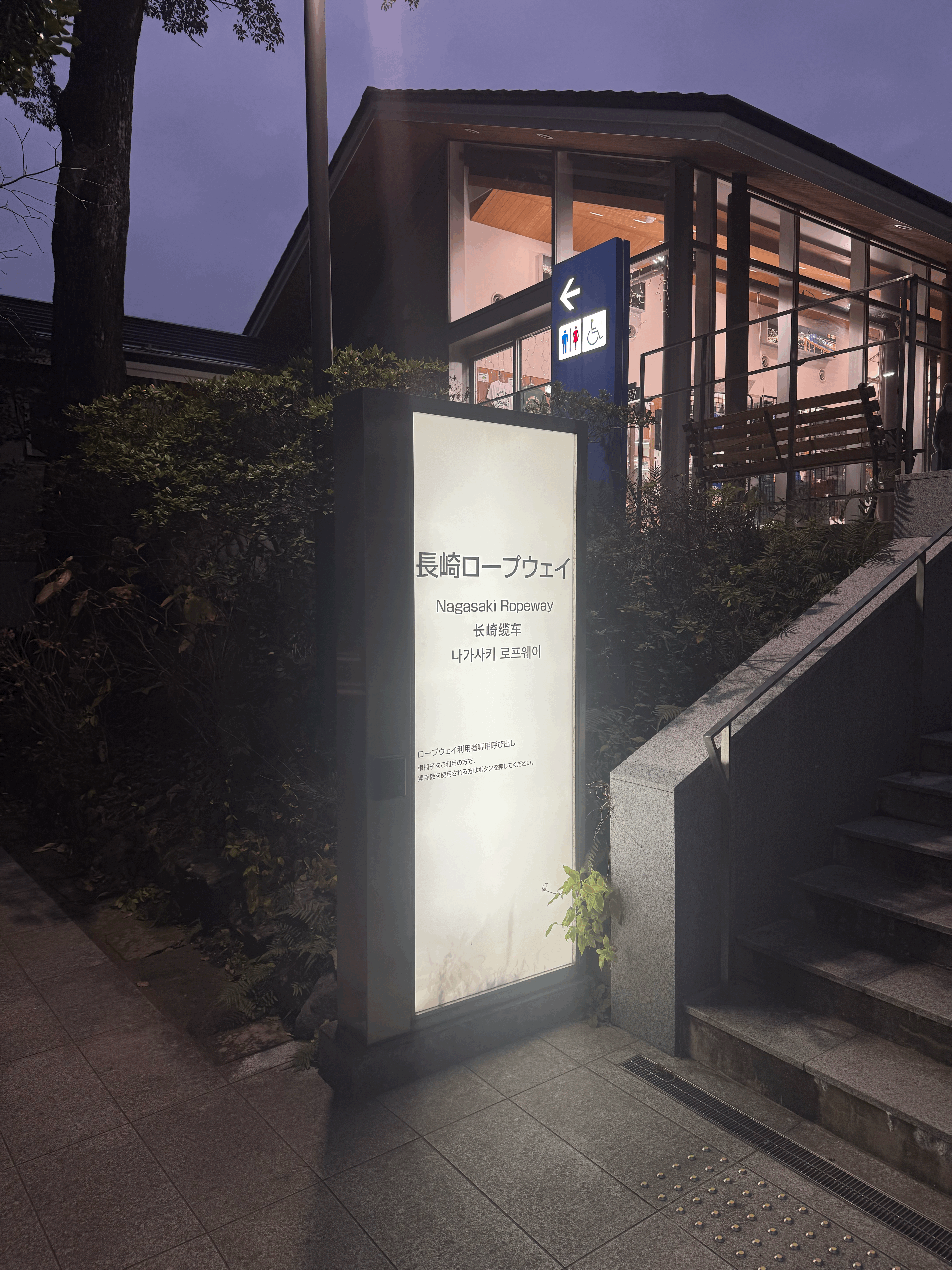 그리고 밤에는 전날에 나가사키역 종합 관광 안내소에서 1000엔으로 사둔 티켓으로 나가사키 로프웨이를 타러 갔다. 4번 버스를 타고 이동하였다. 그리고 18:00에 출발하는 로프웨이를 타고 이나사산의 정상으로 이동하였다. 5분정도 소요되었으며, 내리고 난 후에 300미터 정도 더 걸으면 전망대가 있었다.