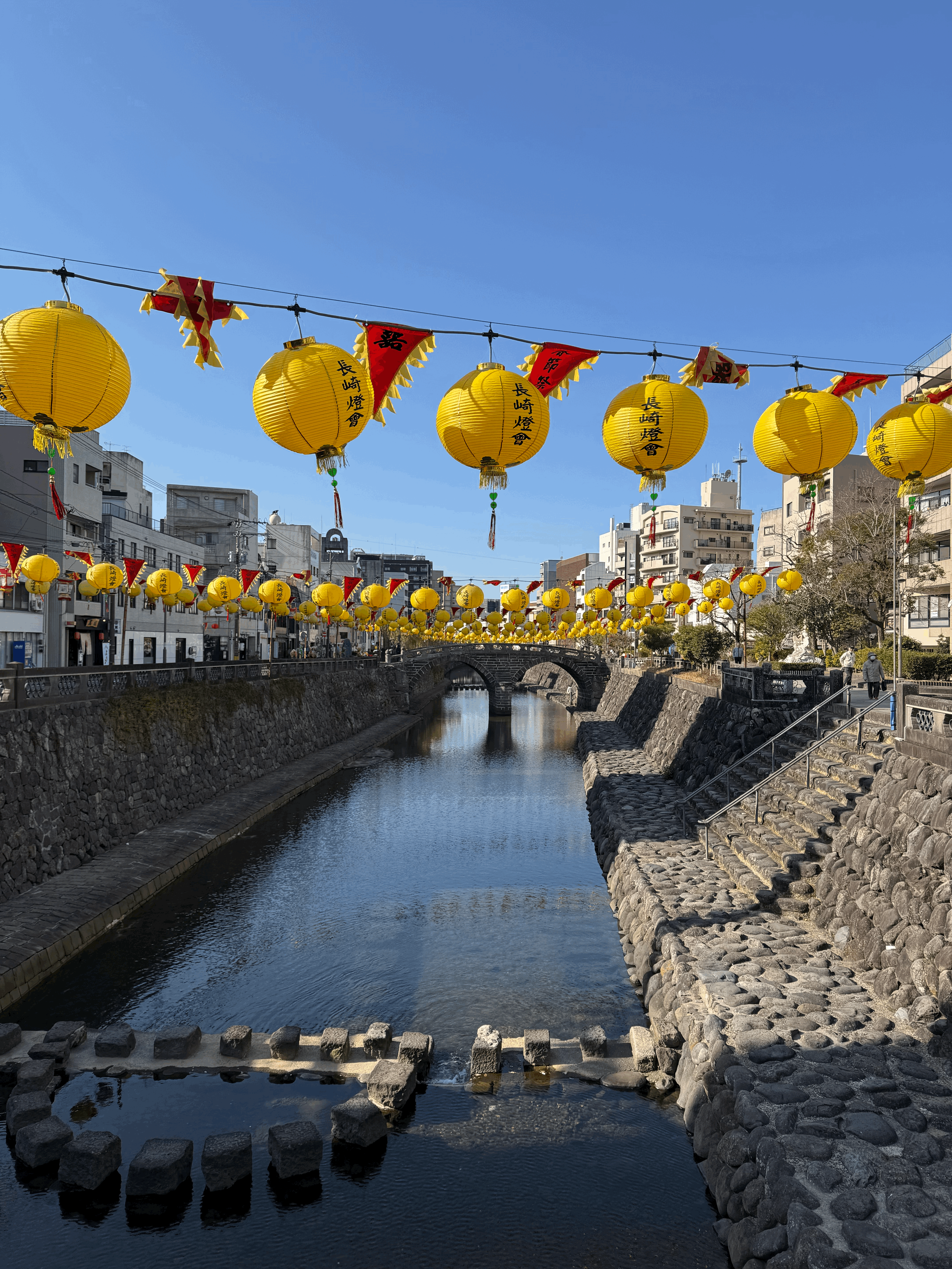 책을 구매한 이후에 메가네바시(안경교)에 방문하였다. 일본에서 가장 오래된 아치형 석교로, 올해로 500년을 향해 달려가는 중이라고 한다. 이 근처에 카스테라집도 많이 위치한다. 메가네바시 앞에 랜턴들은 나가사키 랜턴 페스티벌을 위해서 미리 설치해둔것 같다. 2월 6일부터 시작하여 2월 말까지 페스티벌을 한다.