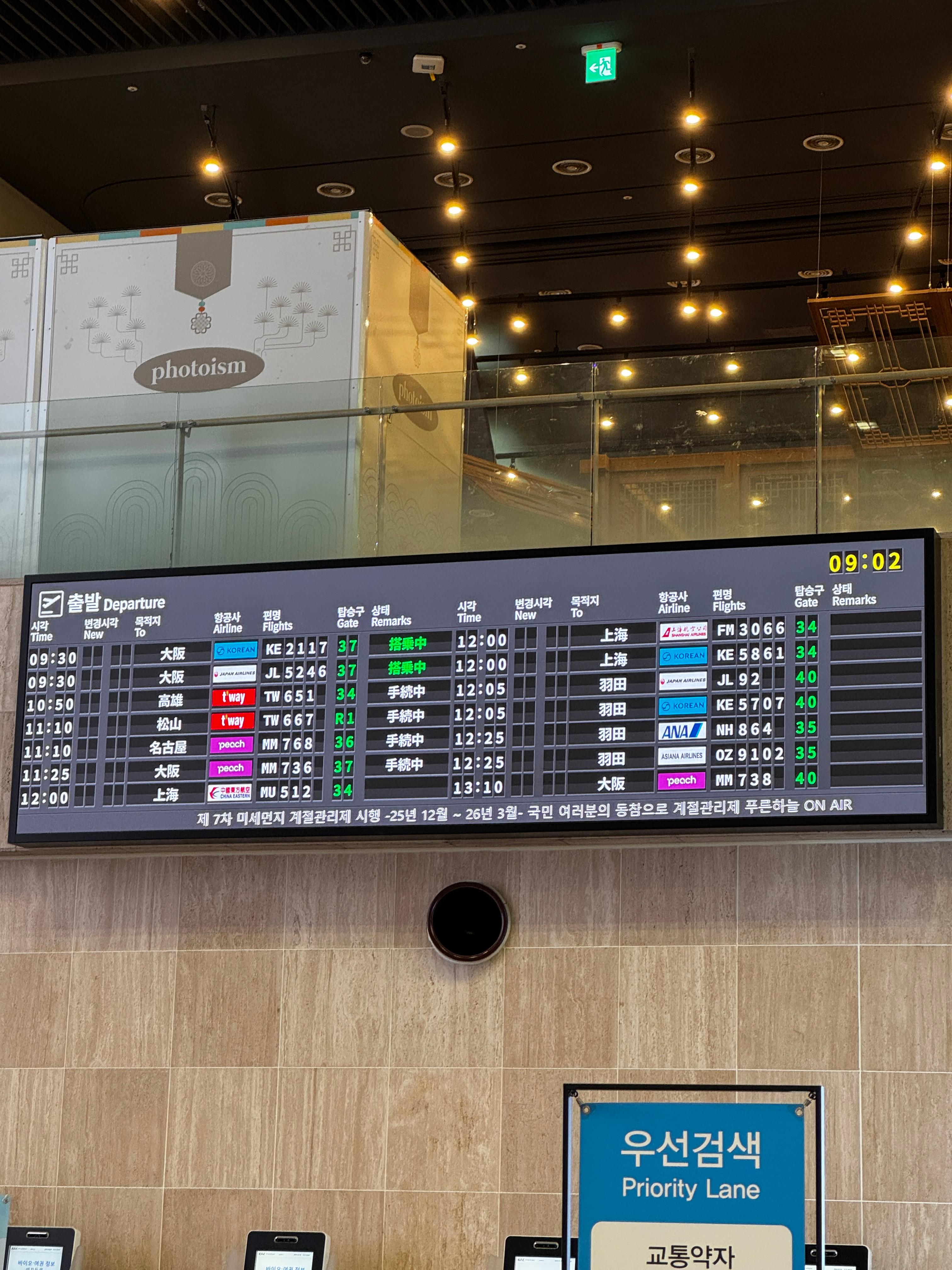 간사이행은 15분 후에 출발한다. 저번에 김해공항에서 등록한 바이오 인증을 통해 짐검사하는 곳으로 들어가서 짐검사를 맡고 나왔다.