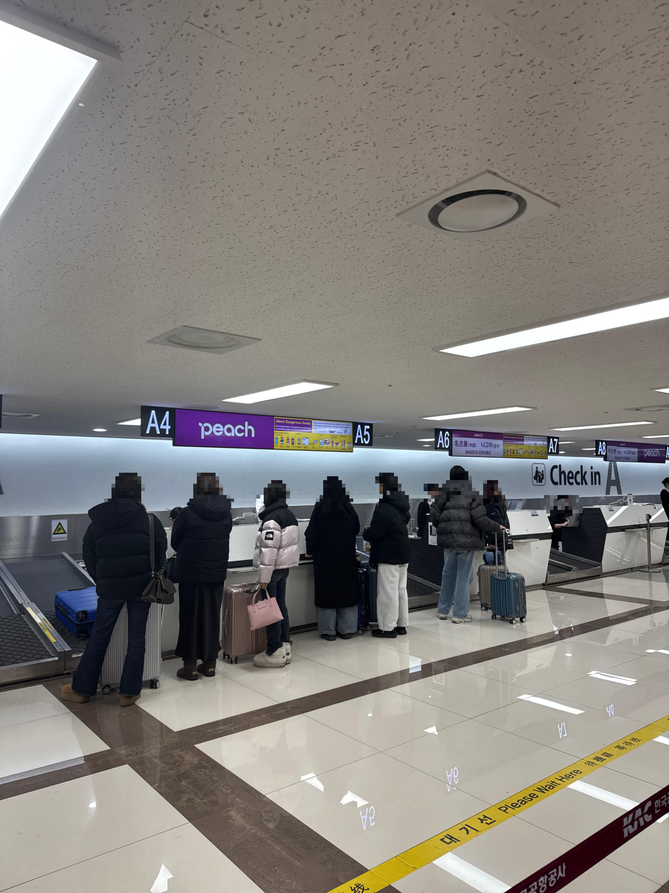 거의 비슷한 시간대에 김포-간사이 노선 또한 운영하기 때문에, 같이 체크인을 하고 간사이행과 나고야행을 같이 체크인 받고 있는 모습이다. A4부터 A8까지는 나고야행, A9부터는 간사이행 수속을 받는다. 짐검사가 빡세기로 유명하고, 기내수하물만 포함된 운임이었기에 걱정을 많이 했지만 7키로에 정확히 무사히 맞추면서 통과하였다.