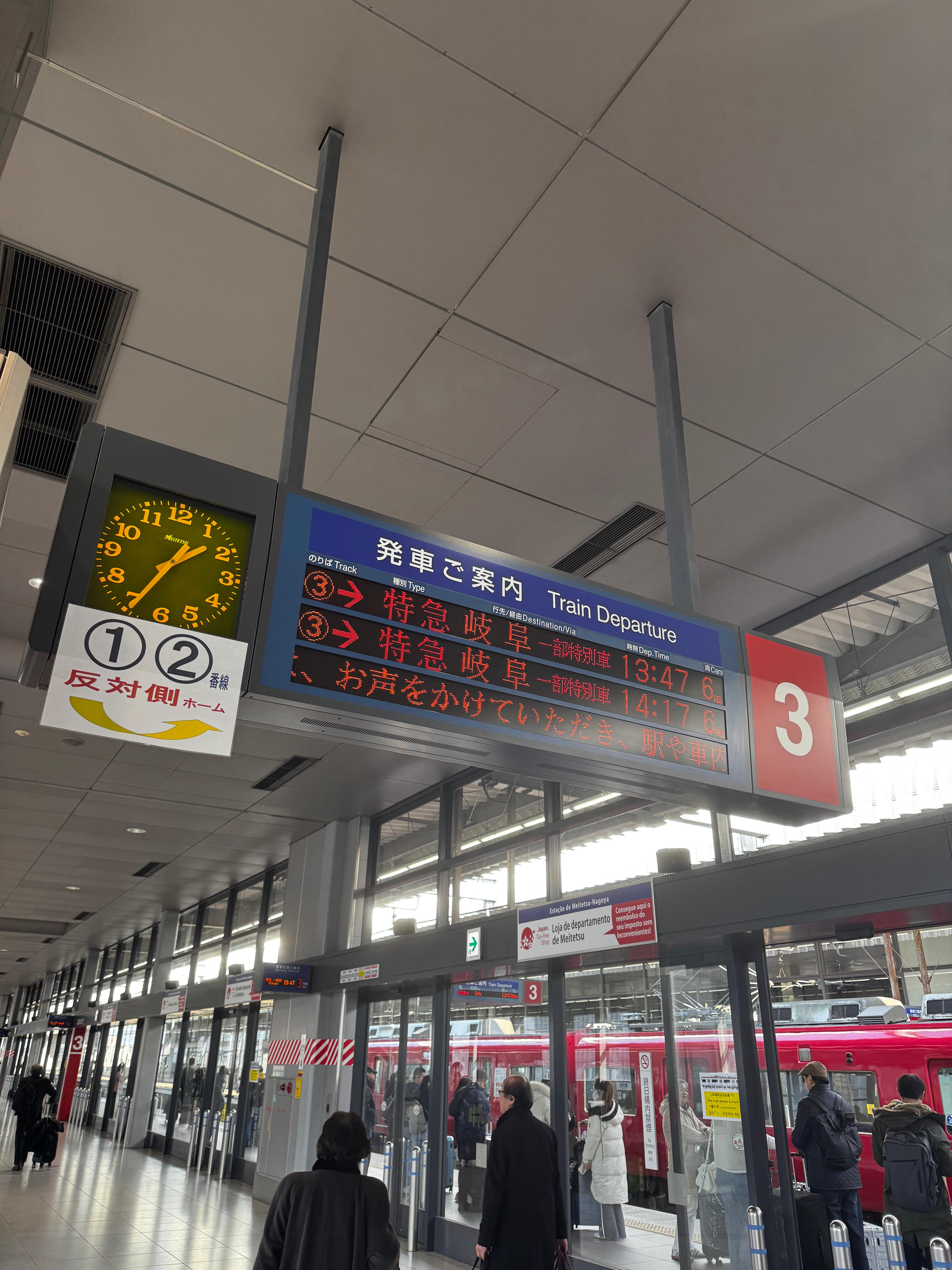 입국층에서 지하철표시를 쭉 따라오면 열차 탑승하는 곳이 나온다. 1번은 뮤스카이, 2번은 완행, 3번은 특급이 있는데, 굳이 4백 얼마 엔을 더 내고 싶지는 않아서 특급열차 자유석에 타기로 했다. 3호차부터 자유석인데, 어디가 문일까 싶지만 잘 보면 철로 쪽에 몇번째 문인지 쓰여있어서, 아무도 없는 곳으로 가서 대기하여 탑승했다. 탑승 후 30분 정도 지나면 나고야 역에 도착하는데, 내리면 된다(나고야역이 종점이 아닌 경우가 대다수). 사카에쪽은 카나야마역 환승이 훨씬 낫다고 들었으니 참고. 마츠모토를 가기 위해 나고야 역에서 하차 후 특급 시나노로 환승하였다.