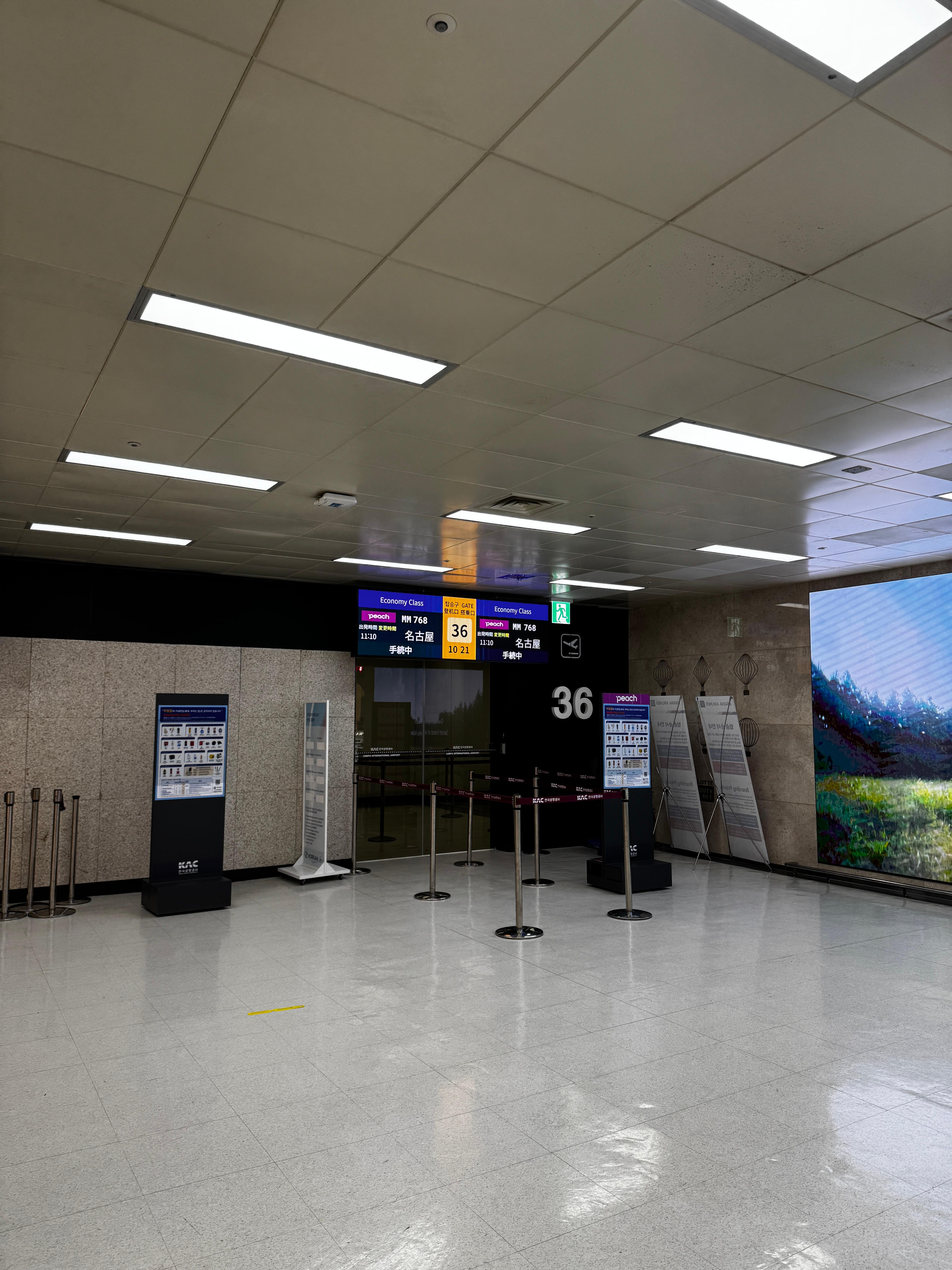 스카이허브 라운지 바로 옆, 출입국심사 게이트 통과하면 바로 있는 36번 게이트에서 탑승한다. 간사이행은 바로 옆인 37번게이트이다. 바로 옆에 보이는 전광판에도 그 내용을 보여주고 있다.
