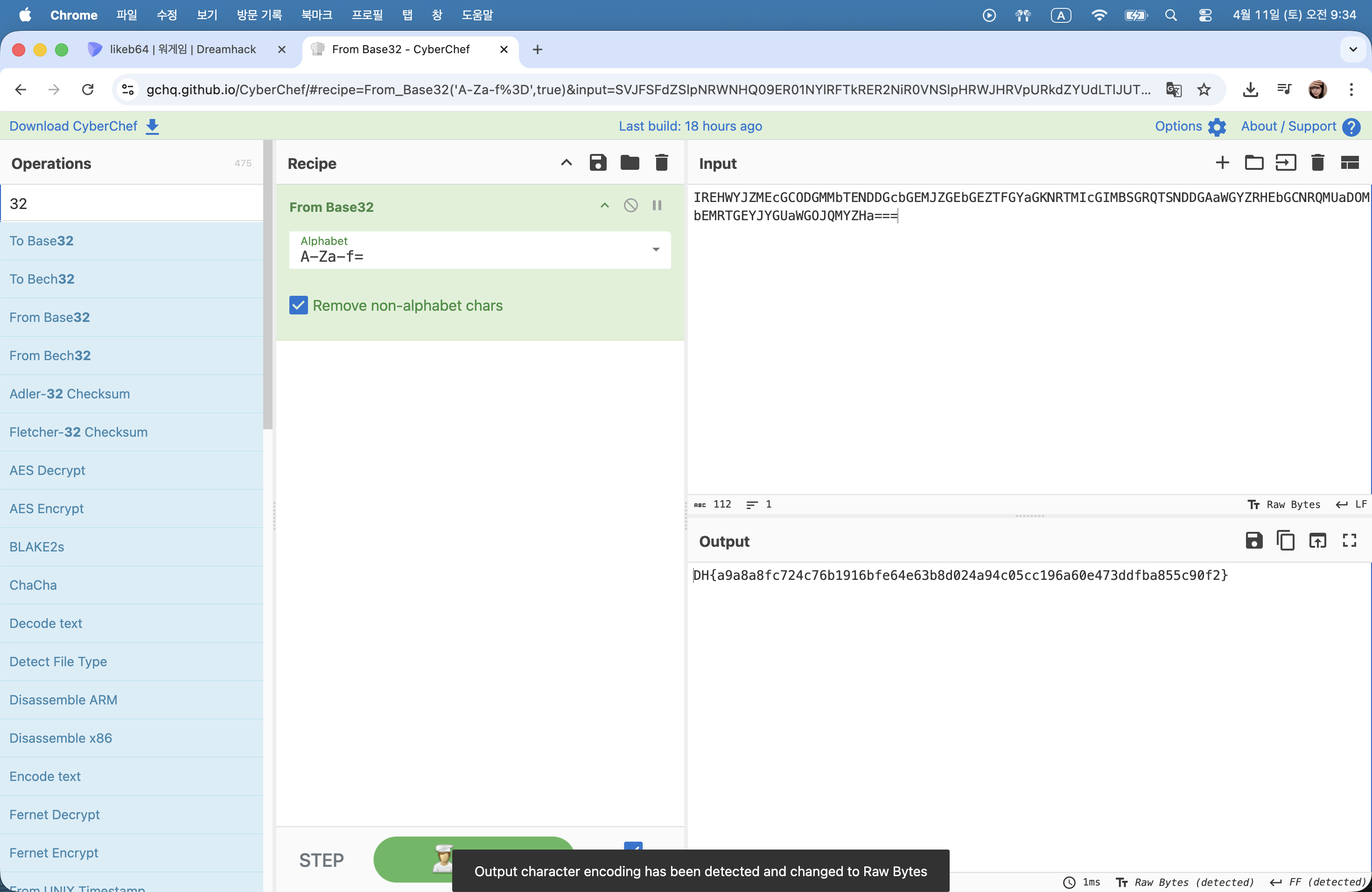 A-Z, a-f까지 32개의 문자를 사용한 Base64가 아닌 Base32 디코딩을 필요로하는 문제였다.